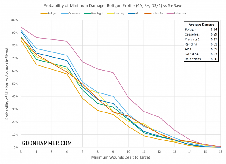Ceaseless which only re-rolled results of 1. The low Save characteristic of the target made the abilities which focused on critical hits or reducing Defense less effective. In general any bonus is a significant improvement over the baseline bolter, improving the mean damage inflicted by at least 10%.