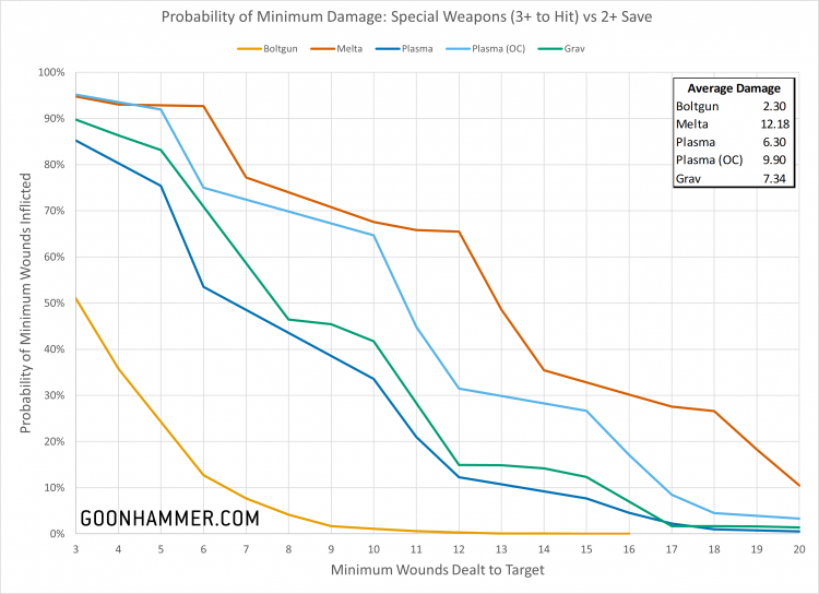 I also thought it might be fun to look at how a few special weapons available to the Astartes would do against a target with a 2+ save. The meltagun has an A4, 3+, 6/3 profile with a 6" range (I refuse to use the dumb symbols), AP 2, and 4MW (meaning it automatically deals 4 mortal wounds on a critical hit). Plasma guns have a 4A, 3+, 5/6 profile with either AP1 or your can supercharge for AP2 but the