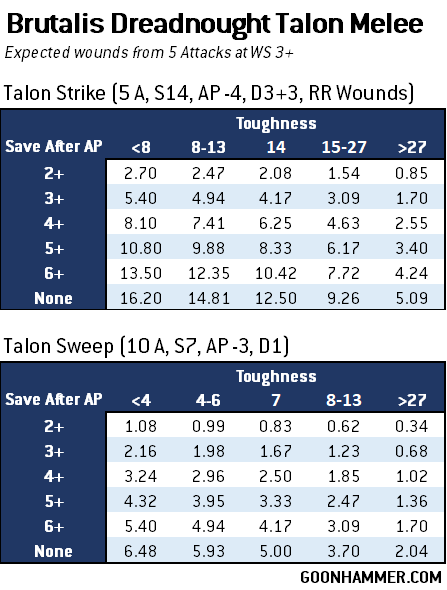 As expected this thing is... brutal. The talon sweep profile is fine for removing chaff if the Dreadnought gets caught in melee against single wound targets, but against anything with two or more wounds the strike profile is going to be ideal thanks to the higher strength, AP, and the ability to re-roll wounds. The sweep profile is anemic enough that it almost feels like it should be triple attacks instead of double, as any large unit that can absorb losing six models per turn will be able to reliably keep this model trapped in combat.