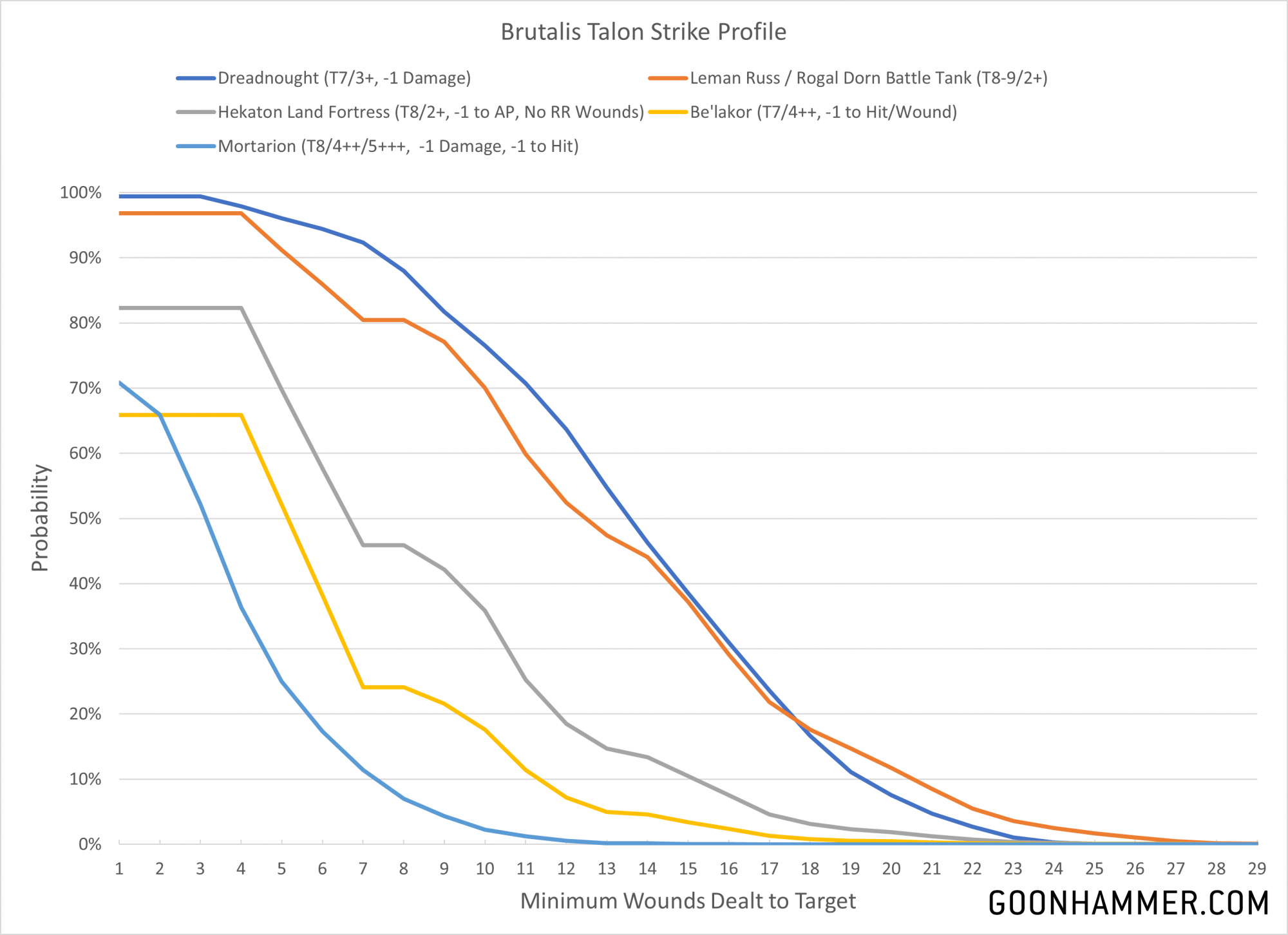 The chart above shows the effect of the strike profile against various targets. You have a greater than even chance of killing a 13W dreadnought on the charge even with the damage penalty, while the T8/2+ profile vehicles are a bit harder to kill. The Brutalis still averages one dead Leman Russ per turn, but the 17W of the Rogal Dorn will only be taken out around 25% of the time. The