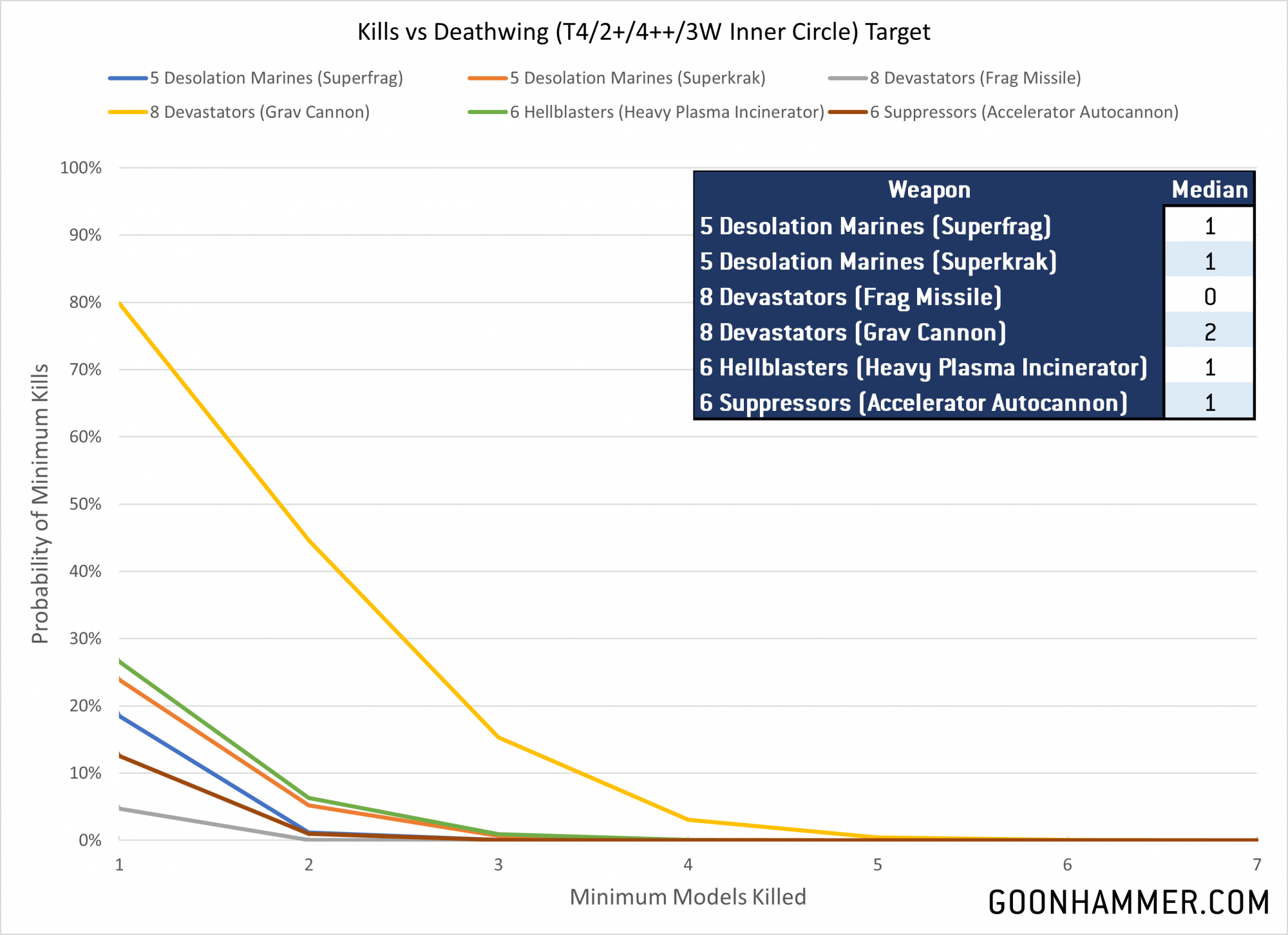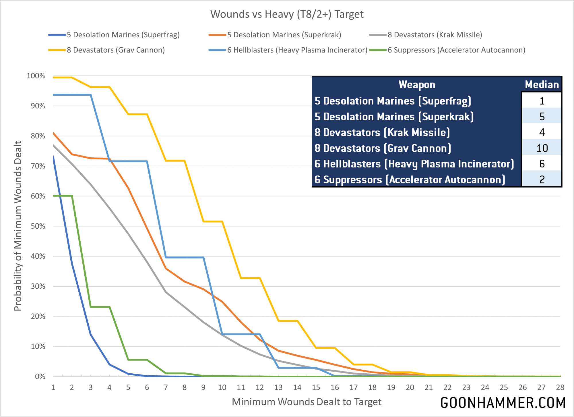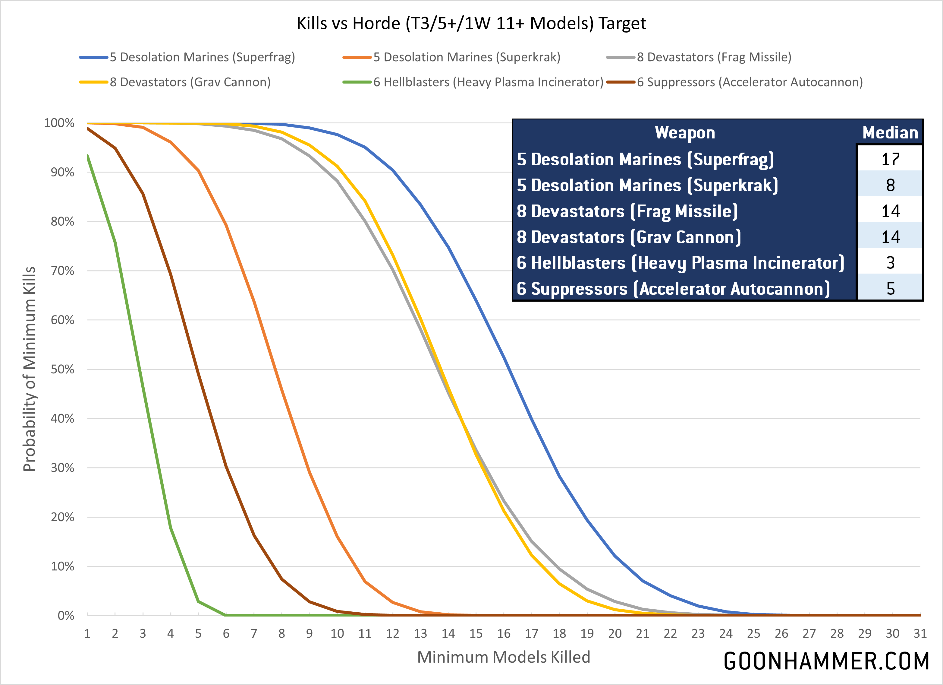 Another option would be Centurions, which cost the same as two Desolation Marines with more firepower, but for now we'll focus on the smaller Marines. A Desolation Squad of 5 costs 175 points so we'll compare them to 8 Devastators (effectively two squads minus the Sergeant), 6 Hellblasters, and 6 Suppressors. For this analysis we'll look at three sets of targets; Astra Militarum troops (T3/1W/5+, Deathwing Terminators (T4/3W/2+/4++ and