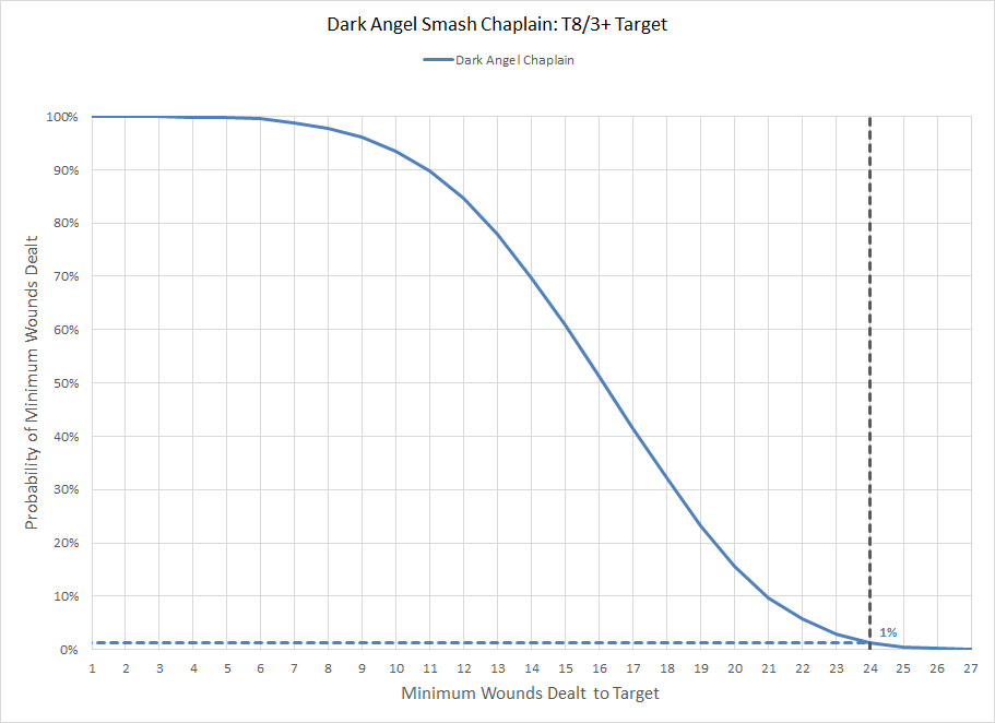 A 3% chance of killing a Knight isn't great, but it's not as horrifying as some of our previous examples. Unfortunately the major issue here is the lack of fixed damage; on average 1d3+1 is equivalent to a basic thunder hammer. Most of the really lethal builds deal four or even five points of damage on each swing. On the other hand it's a massive improvement over what Dark Angels had before, and it has a great chance of killing lighter threats like Repulsors.