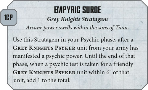 The Grey Knights received a much-needed boost as well in the form of new powers and Stratagems. The Empyric Surge Stratagem, also previewed on Warhammer Community last week, gives Grey Knight armies a significant boost when clumping together, particularly since Grey Knights can spam Smite without penalty thanks to their Brotherhood of Psykers ability. When combined with the Tide of Escalation Tide which adds an extra point of damage to the "baby Smite" cast by units with Rites of Banishment, you establish the ability to reliably unleash a healthy number of mortal wounds, especially if you can put 2 or 3 units in place to benefit from Empyric Surge.