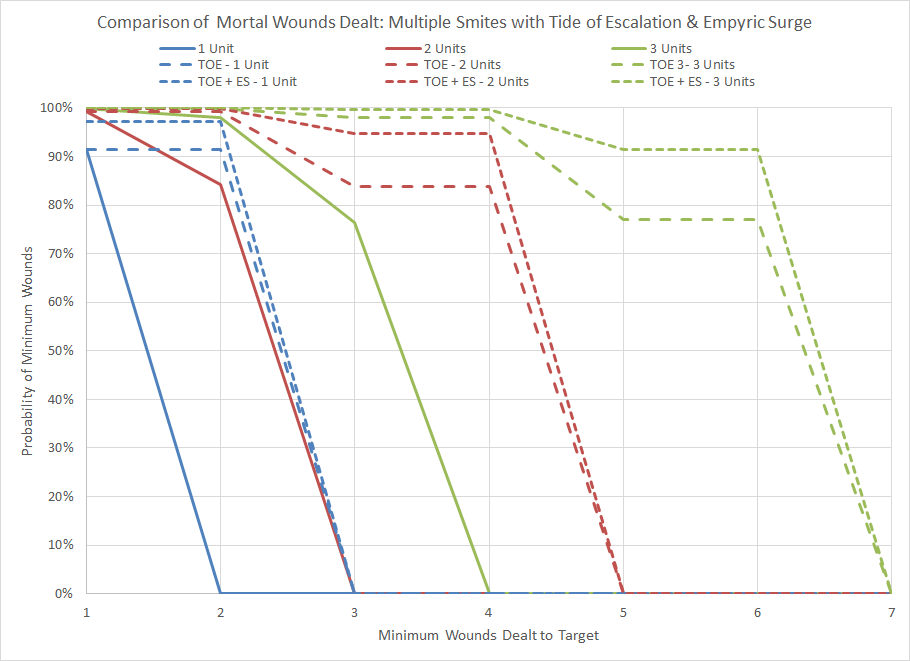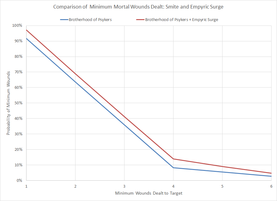 Empyric Surge also provides a good boost on the damage output of units which cast a regular Smite, as the +2 bonus provided with the combination of Brotherhood of Psykers increases the chance of dealing 1d6 mortal wounds.
