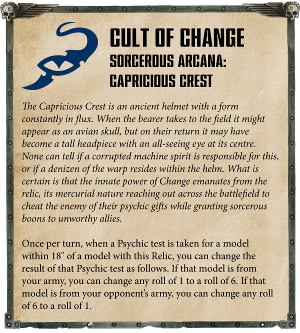 First previewed on the Warhammer Community site, this Relic is huge. There are very few abilities in the game which directly alter a die roll like this, and The Capricious Crest is particularly interesting because it has the ability to take the worst possible roll and covert it to the best, either in offense or defense. Note that since the power is once per