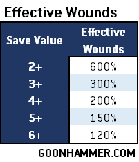 Something that players will note is that while the Resurrection Protocols ability is mitigated, the presence of a 5+ Feel No Pain is going to be very prevalent. C'Tan shards all have access to it (while also halving incoming damage), and the Technomancer will be in demand as not only provides a 5+ Feel No Pain but also allows a model within 6" to gain D3 wounds at the end of each Movement phase. While a 5+ may not seem very impressive, in reality wound-ignoring abilities are extremely potent because they apply to every incoming attack. In other words Feel No Pain applies to damage that had to be inflicted to make up for damage that was previously ignored, and so forth. The chart below shows the effective wounds (EW) that result from this ability. A 10 wound model with Feel No Pain 5+ is equivalent to a 15 wound model with no ability to ignore wounds.