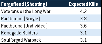 Here Veterans of the Long War once again wins before we apply any Stratagem bonuses, giving us an expected 4.2 kills with the Forgefiend on Terminators. Renegade Raiders and Soulforged Warpack do nothing for us here, as the bonuses to wound and AP hardly matter for the Forgefiend. On the other hand, they
