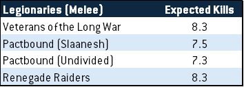 When it comes to our Legionaries hacking away, Renegade Raiders gives us the edge here - ten Legionaries are likely to score 6.8 wounds in melee against an Armiger on an objective, as they're now able to drop him to a 5+ save, while comparatively Veterans of the Long War only averages out to 4.5 damage and Pactbound Zealots comes out to about 4.