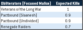 If we put our Obliterators in Melta Range (within 9") and unload with their Focused Malice profile, then in Veterans of the Long War they'll average