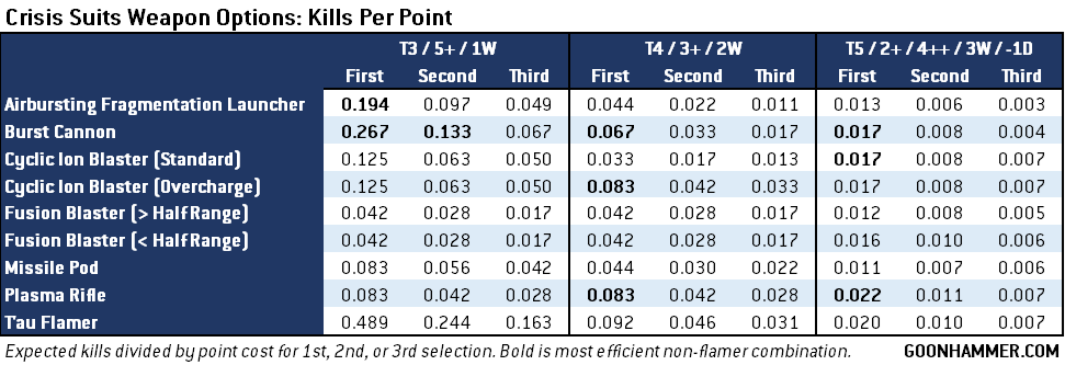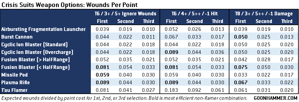 Against the higher-wound targets the fusion blaster makes a consistent appearance along with the plasma rifle. Depending on the target the optimal remaining gun may be either the missile pod, the cyclic ion blaster, or the burst cannon. Note that the cheap flamer once again makes an appearance courtesy of automatically hitting the target and its very low points cost, but as before the range is a concern. That said, if you're running Farsight Enclaves, you'll likely be doing a lot of your work at the 12" range, and so the flamer should receive more consideration.