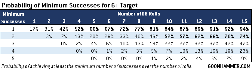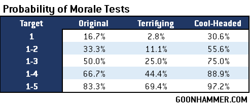 Terrifying: Monster units force enemy units within 6" to roll two dice when taking a Morale test and discard the lowest. This squares the probability of success as you must now roll below the target number on both dice, and the impact can be seen in the chart below.