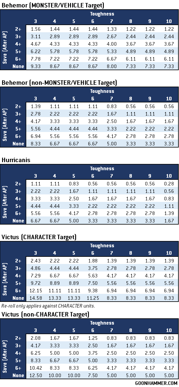- The combination of additional damage and the ability to re-roll wounds makes Victus the superior choice against all CHARACTER targets regardless of Toughness.