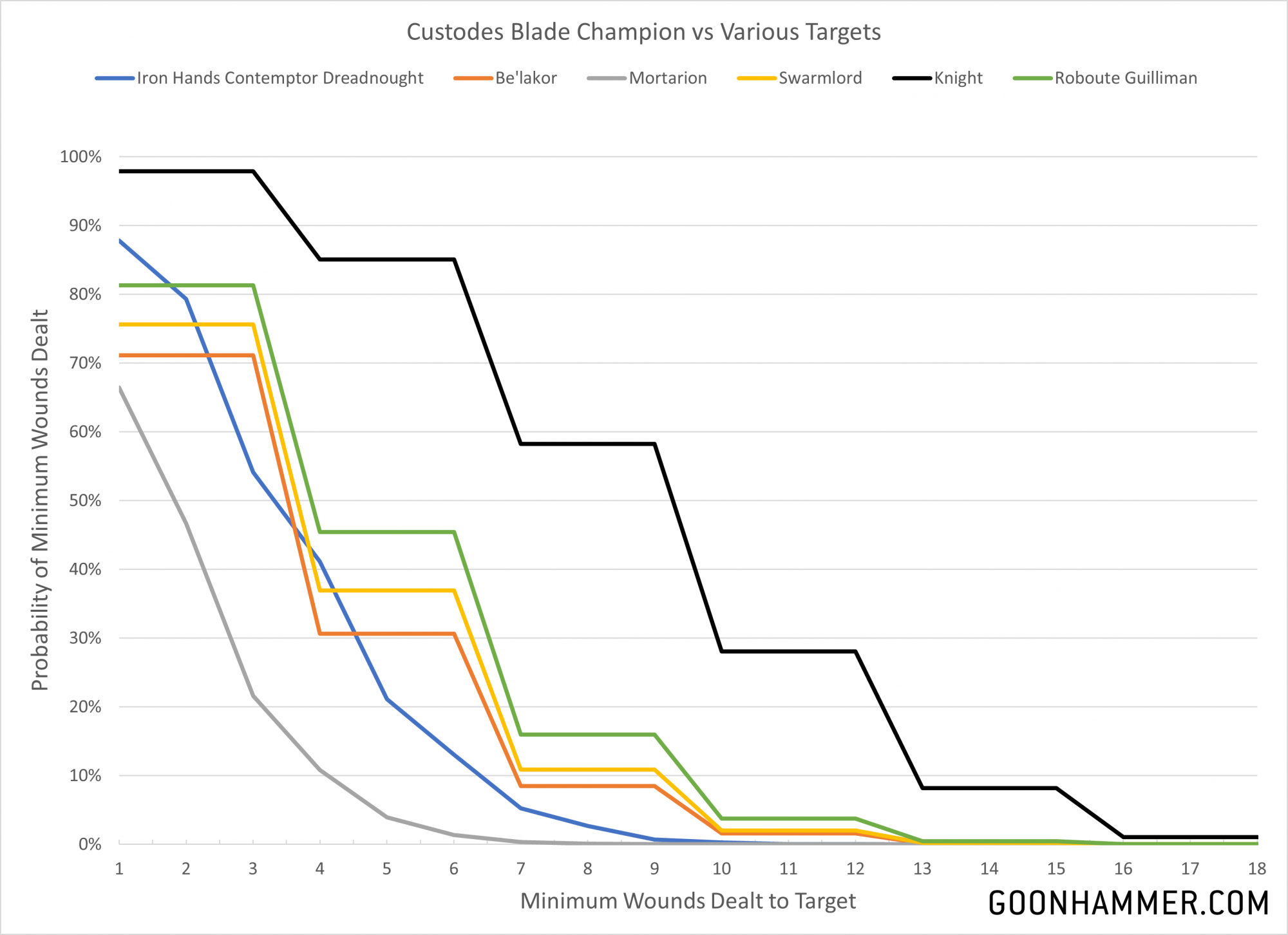 Since the goal of the Blade Champion is clearly to find the biggest, nastiest, most threatening hero on the other side and cast them down, what kind of damage can we expect this Custodes to do against various marquee threats like Bel'akor, Mortarion, or a Knight? Let's take a look at some options: