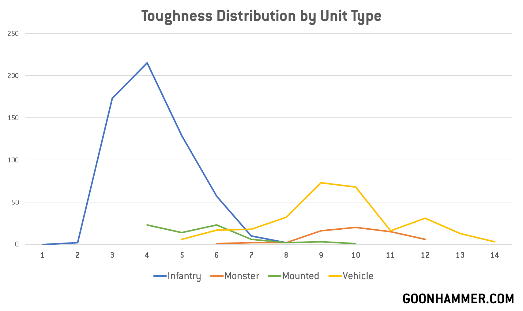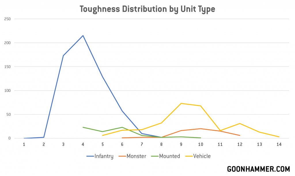 Whereas in 9th edition the vast majority of vehicles had Toughness 7, with a smattering of T6 and T8 for lighter and heavier vehicles, respectively, we now see that more than two thirds of the game's vehicles are T9+, with more than half falling in the T9-10 range. This is also true for monsters, where most datasheets have T9-11, depending on the size. We can get a good idea of how toughness values fall out for each major unit type by plotting these: