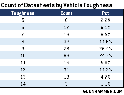 Let's start with unit Toughness. One of the biggest changes of 10th edition was changing the Toughness scale for vehicle and monster units, reducing the soft cap of 8/9 and allowing those units to have up to 14 Toughness. However the flip side is that most weapon strengths stayed in the same range, meaning vehicles generally got tougher to wound. We can take a look at this by looking at vehicle Toughness values: