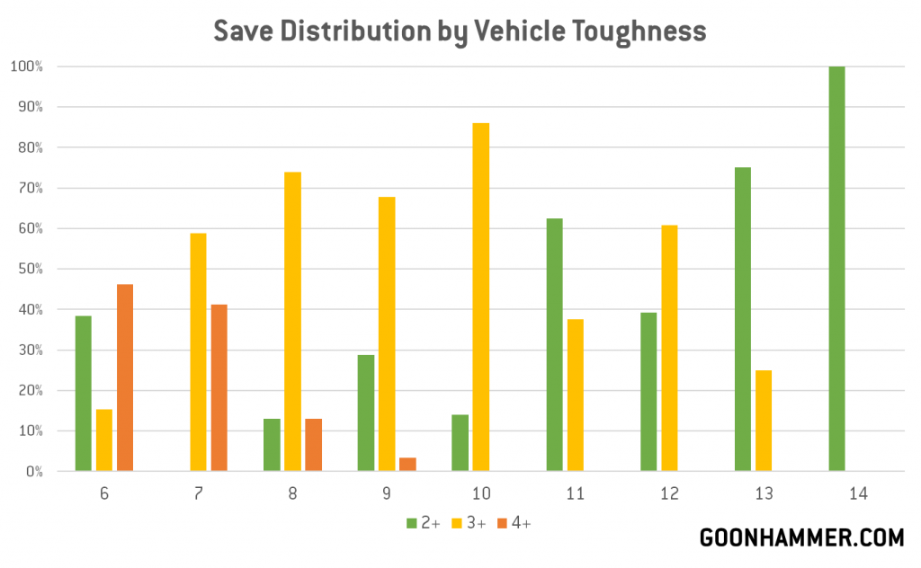 Generally speaking, that high Toughness on Vehicles and Monsters also tends to come with good saves. Nearly two thirds of vehicles have a 3+ save (65%) regardless of Toughness, and another 25% come with a 2+ save. There are a few - notably lighter vehicles with lower toughness - on the 4+ end, but no Vehicle in our dataset had worse than a 4+ save. And for the most part, 2+ saves tended to be distributed to higher-toughness vehicles, though Broadsides and some other options notably skew this a bit to create a category of T6 2+ save vehicles.