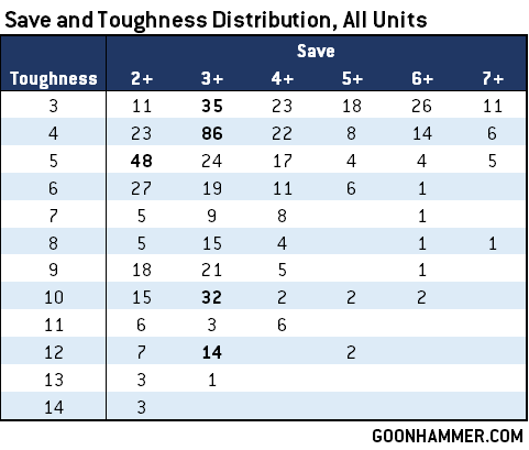 Of course, toughness values are only half (or one-third, really) of the equation when we're talking about how durable a unit is, so let's next turn to saves.
