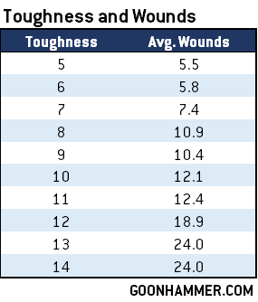 Again, this is different for Monsters, where Toughness values top out at 12. Monsters tend to average 8-10 wounds until you hit T10, at which point they jump up to 13, and at T12 the average monster has 18 Wounds.