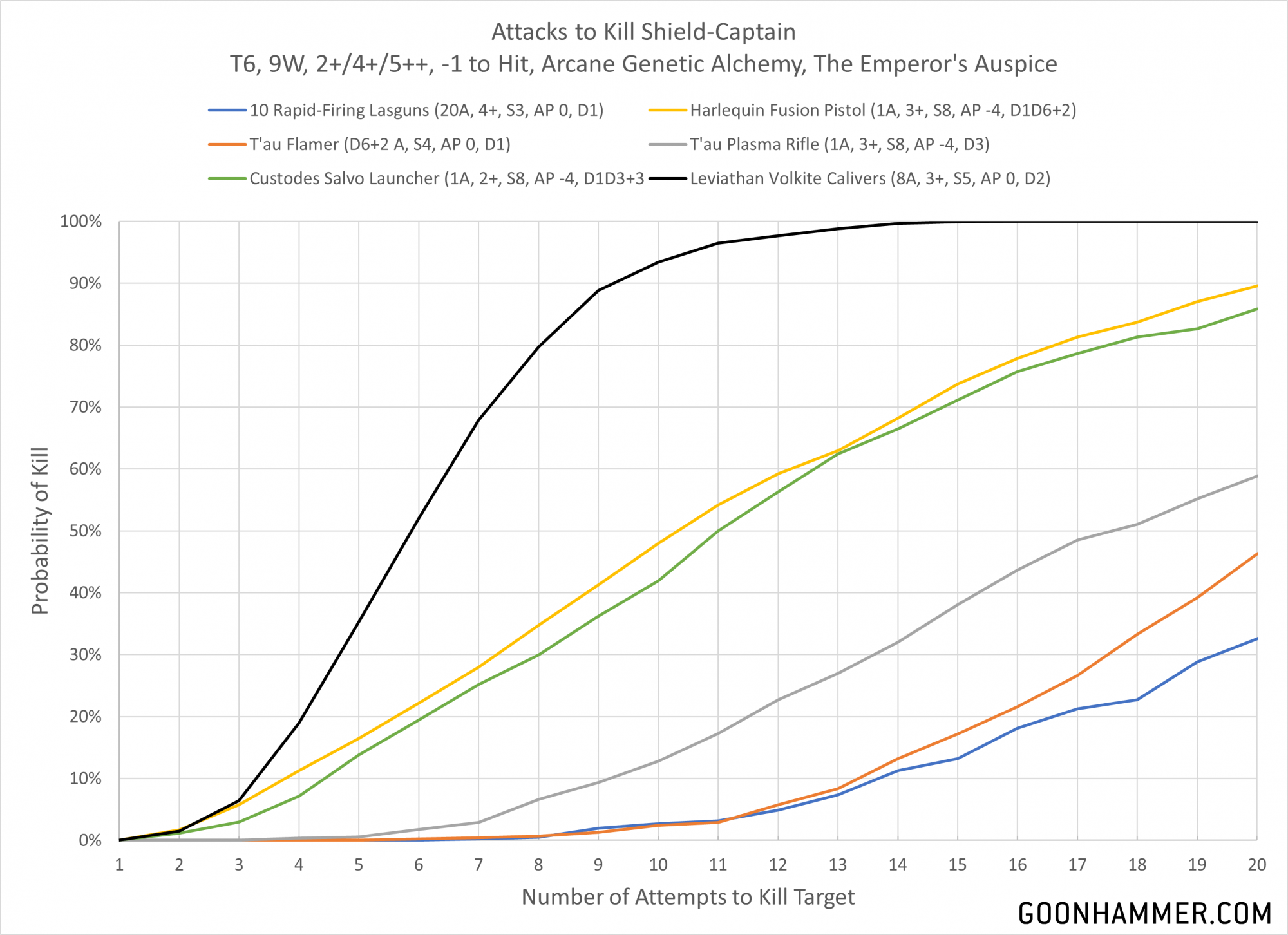 We quickly see that even the Leviathan struggles with this target, and most units aren't even worth rolling the dice on. The combination of mitigating the hit and wound rolls, high invulnerable save, and the option to disregard wounds makes smaller attacks like this largely irrelevant. For some weapons like T'au plasma rifles and flamers the poor performance can be offset by volume of fire. On the other hand even 200 Guardsman rapid firing their lasguns at point blank range only have a roughly 1 in 3 chance of killing the Custodes.