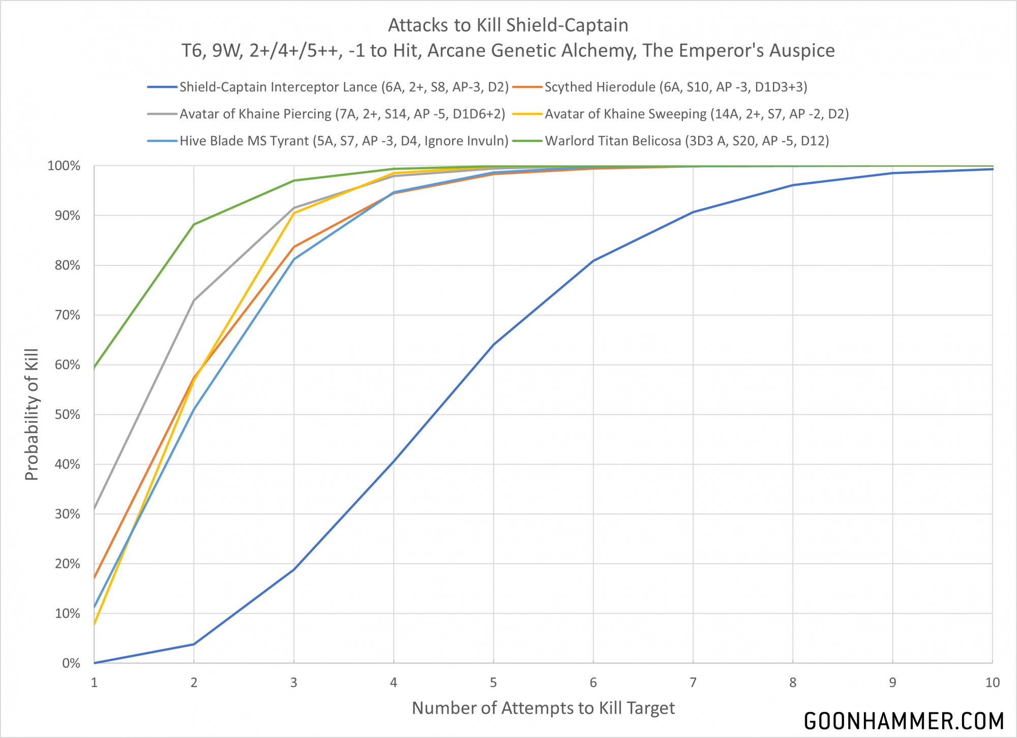 For the purpose of this analysis we'll assume that the Shield-Captain is fully tooled for defense, meaning it has a T6/9W/2+/4++/5+++ profile with -1 to hit and that any attacks will be offset via both