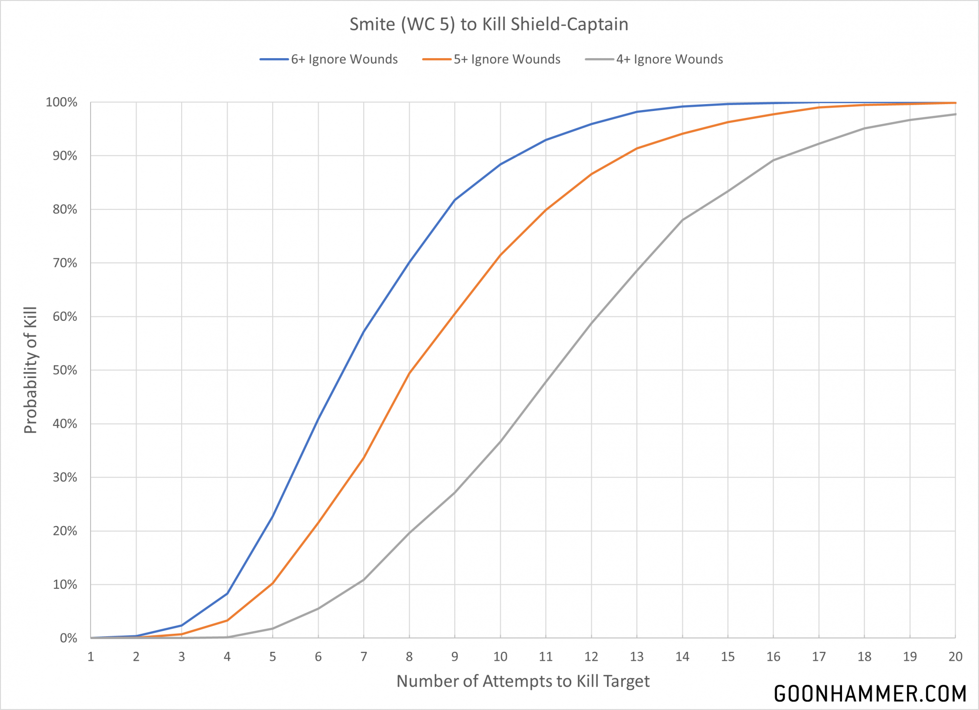 Superior Creation trait can ignore them on a 5+ and any member of the Emperor's Chosen Shield Host will ignore them on a 4+. With that in mind we can chart the number of Smite attempts required to deal the nine mortal wounds necessary to kill the Shield-Captain. We can see in the chart below that the numbers are not very high, with even an unprotected Shield-Captain requiring 7 Smite attempts to kill it more often than not. Applying the 4+ from Emperor's Chosen increases this requirement to over 11. What's worse is that this bonus is universally applied across the entire Custodes army, making it particularly challenging for any force which relies on the relatively scarce application of mortal wounds to have an impact.