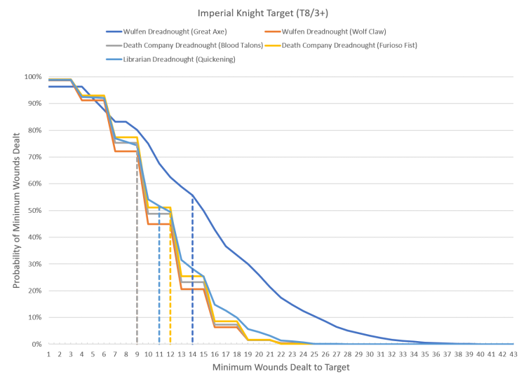 For the chart below we take a look at our old friend; the T8/3+/24W monstrosity that is the Knight. The Wulfen units will use