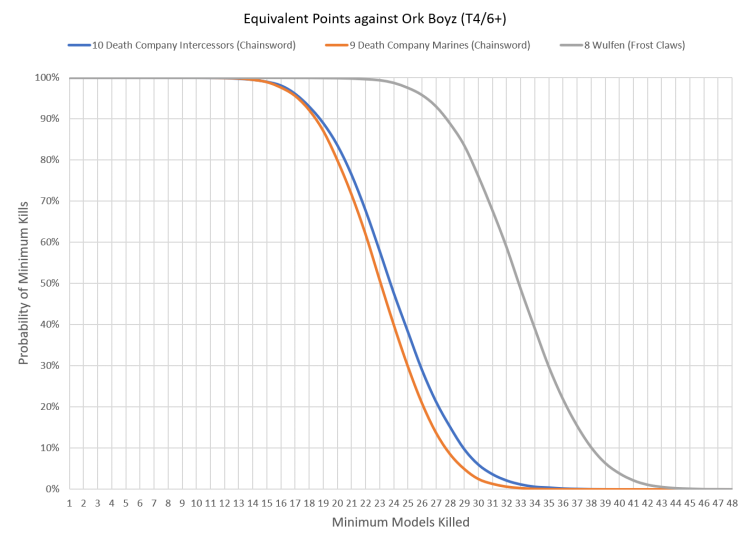 - The Wulfen consistently outperform the Death Company on a per-points basis thanks to a combination of high strength and access to wound re-rolls through their frost claws; they can afford a few casualties relative to their black-armored brethren and still be as effective.