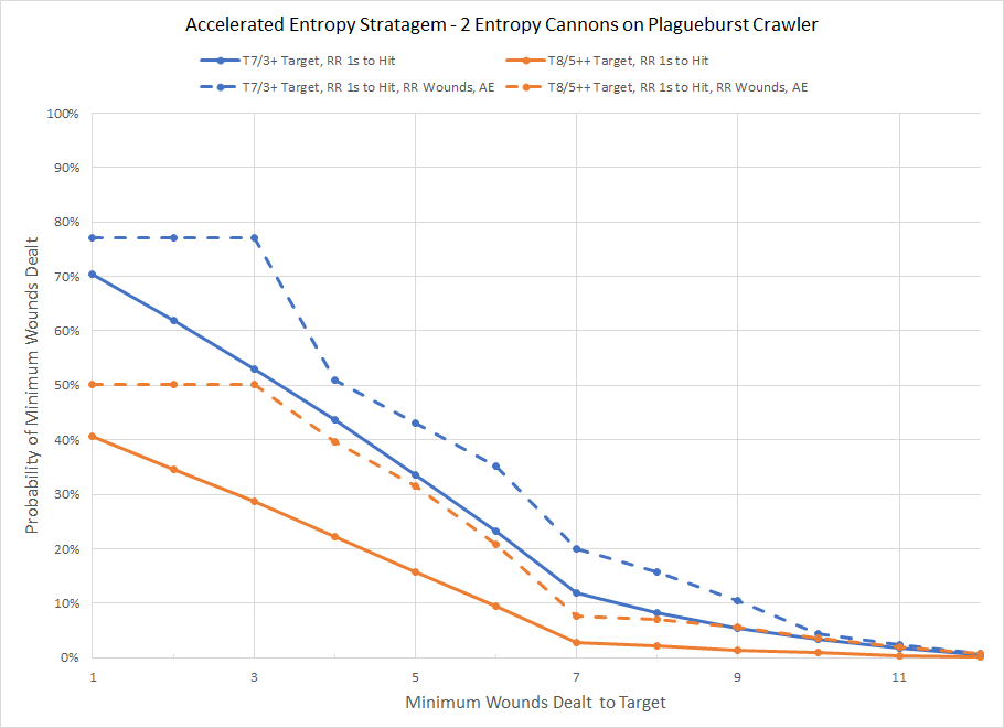 To examine the impact, we'll take a look at a Plagueburst Crawler firing a pair of entropy cannons under two conditions. Under the first condition (solid lines) the Crawler will have no bonuses but be within the re-roll arc of a Chaos Lord. In the second scenario (dashed lines) the Crawler will have