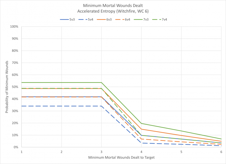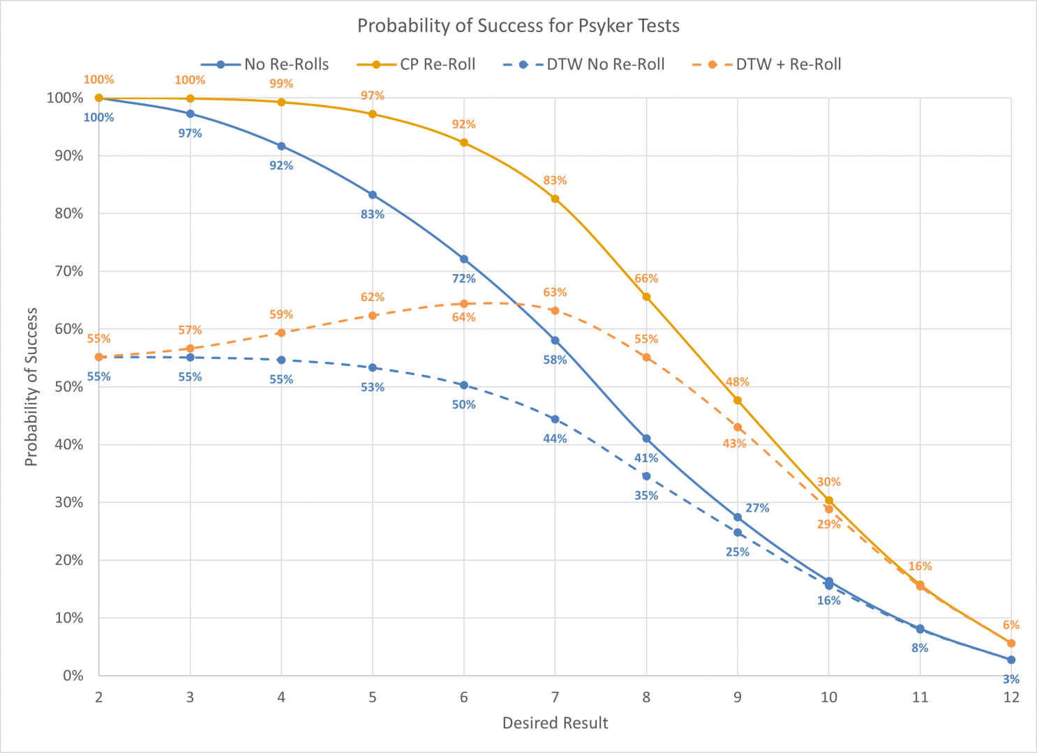 As a quick refresher, here's what the probability of successfully casting a spell looks like based on the Warp Charge cost, the use of a CP re-roll, and the odds of successfully casting a power while the opponent takes a Deny the Witch test. For example, a player manifesting a WC2 power against someone performing DTW would be successful 55% of the time.