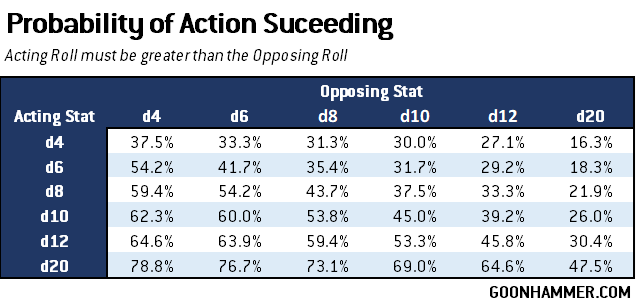 - Improving the acting stat so that it is higher than the opposing stat produces the greatest improvement in probability of success; beyond that the demands are diminishing.