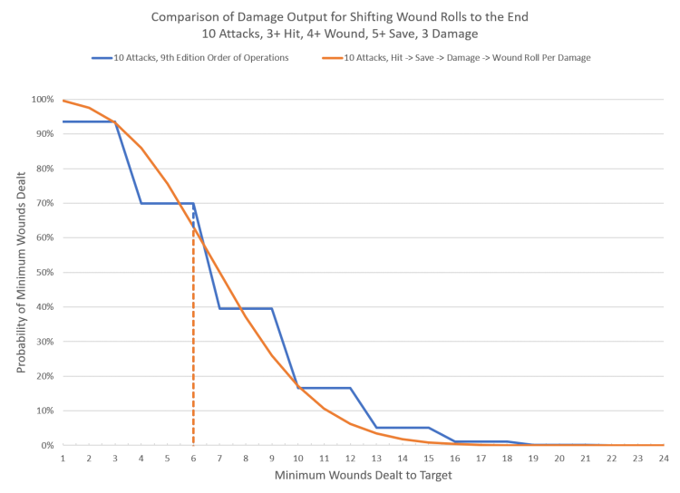 By changing the order of operations in this fashion the average wounds dealt remains the same, but the probability distribution shifts to a smoother curve. This produces the same effect as the various ignore wounds abilities which apply to each individual wound dealt. The end result is that the mean result is the same, but the outcomes are far less 'swingy' than they currently are. This is the only way that changing the order of operations of an attack sequence would result in changing the outcome. Whether or not it's a better choice is a matter of personal preference (I'm a fan, plus it means a 'wound' roll finally causes wounds), but it's an example of how to change the outcome by changing the order.