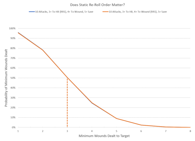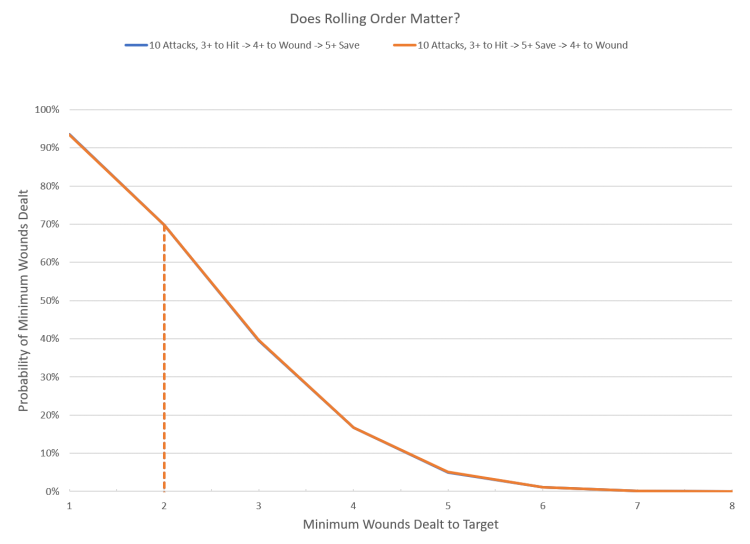 commutative (meaning you can switch the order of operations around with affecting the outcome), this means that the order of operations for the basic Hit -> Wound -> Save progression is irrelevant. Sure enough if we apply these values to a sequence of dice rolls we get that the two overlap. The slight variation in curves for the chart below is due to the fact that the chart was taken from a simulation of 100,000 rolls. If you use an exact solution like the