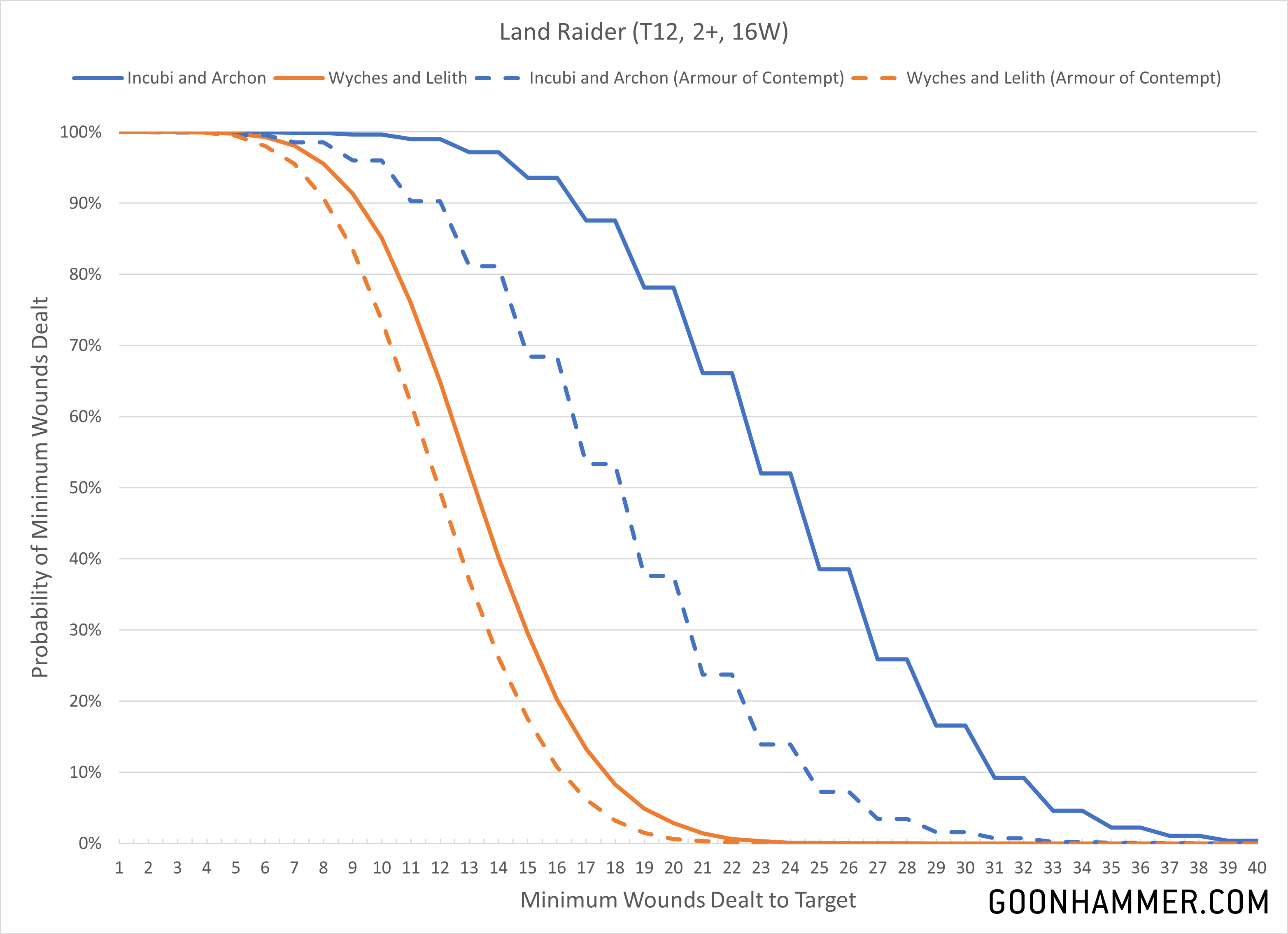 We've looked at an ideal target for these two units - i.e. power armoured infantry. What about the other end of the scale - the Land Raider? The Incubi show that they can reliably kill one, even with Armour of Contempt utilized, and far outstrip the Wych unit. The Wych Squad has a roughly 20% chance of dealing enough wounds, but the low damage really causes problems for the unit. This chart also shows you exactly how impressive the synergistic effects of modifiers and re-rolls are, with lowly S4 units bringing down a T12, 2+ save Land Raider.
