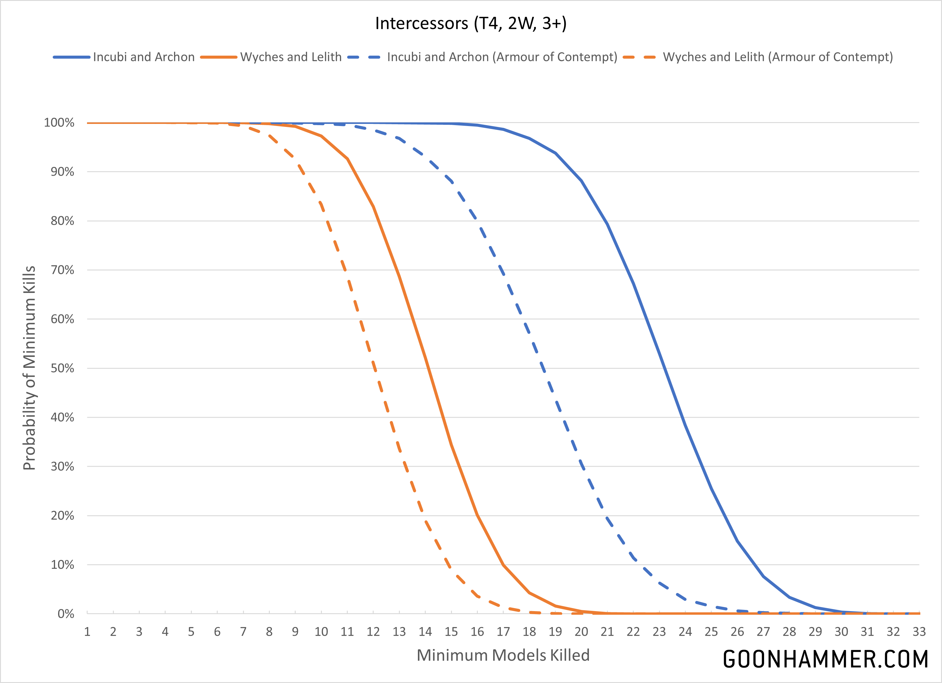 The third takeaway, unfortunately for the Space Marines, is that these units put out so much damage that Intercessors don't stand a chance. Even through Armour of Contempt the Wyches are going to kill 10 around 95% of the time, and the Incubi hit so hard that their floor is 11 models near-guaranteed to die with a 50/50 chance of killing 19. Intercessors, of course, don't come in squads of more than 10, but it's worth bearing this in mind for the few Marine units that do such as the Black Templars' Crusader squad.