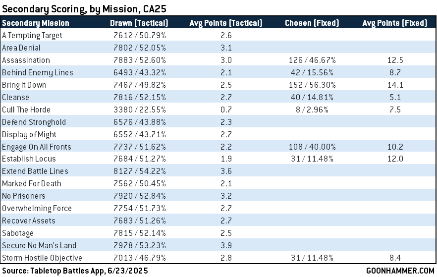 The second takeaway is that most of these secondaries are worth about 3 VP when you draw them. The big exceptions here are Extend Battle Lines and Secure No Man's Land, which remain slam dunks as free VP more or less, and Establish Locus and Behind Enemy Lines, which are much harder to score. Players largely tend to ignore fixed missions these days - a good thing, in my opinion - but when they don't, Bring it Down is the clear favorite, bringing in an average of 14 VP per game. Though this may go up with the changes to Imperial and Chaos Knights making those armies more viable. Assassination is the clear second favorite, though even against big knight armies you may struggle to score more than 12 with it.