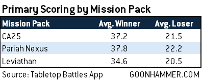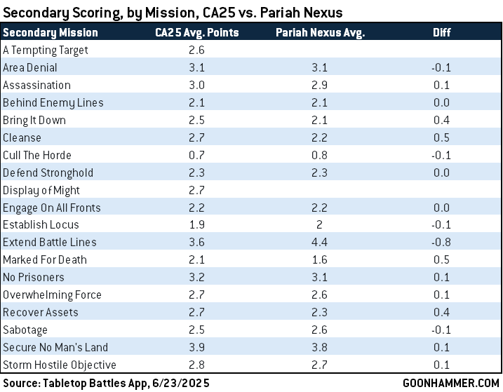 At first glance, primary scoring in CA25 hasn't changed much - while Pariah Nexus saw a jump in primary scoring from Leviathan. This was primarily due to changes in the primary missions allowing for more scoring from things like actions - which were more or less introduced with Pariah Nexus - and improvements to missions like Purge the Foe.