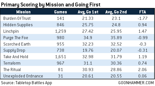 Right now, it's mostly a novelty. There are some things we're keeping an eye on - the disadvantage in primary scoring correlates with a general disadvantage to going first that we're sure will have some kind of impact/entanglement with Challenger cards. But it's early days with that dataset and we're still collecting more data and trying to figure out what works. Initial data suggests that going first is generally very undesirable in any mission except for Burden of Trust (more on this in the future, since it doesn't line up with the primary data), and while primary scoring is slightly lower, it's not so much lower that we'd expect to see these results - this may be a Challenger impact at work. We'll be back in future articles to investigate that more fully.