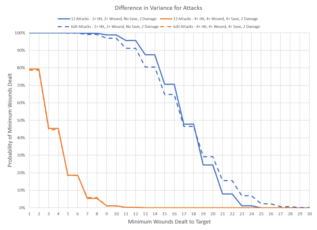 The reasons for these outcomes can be seen in the probability distribution curves below. These curves are slightly different than the bell curve; instead of showing the distribution of results they show the distribution of results that are greater than or equal to a given value. This is more helpful for miniature wargaming, as it's more important to know the probability that an attack will deal at least 3 damage rather than a specific amount. The 50% mark indicates the peak of the bell curve. The blue lines represent the high probability scenario, the orange lines the low probability scenario. The solid lines show the baseline, with fixed damage and attacks, while the dashed lines show the result with the random variable; either damage or number of attacks. We can see that for the orange lines 20% of the attacks result in no wounds dealt, while for the blue lines all of the scenarios inflicted at least some damage.