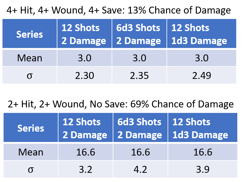 Within Warhammer 40k two of the most common sources of variation are a variable number of shots and a variable damage value. Assuming a fixed probability of damage, does the source of variation affect the outcome? In other words does it matter if my unit of 6 models is firing 1d3 shot weapons that deal 2 damage each, or 2 shot weapons that deal 1d3 damage each? The expected value for each attack should be the same; 6 models firing an average of 2 shots and dealing an average of 2 damage multiplied by the probability of damage. Assuming a 4+ to hit, 4+ to wound, and a 4+ save that's around 3 wounds per attack. Does the variation change if the probability of damage is different; would the result be different if the attacking unit had a 2+ to hit, 2+ to wound, and the target got no save at all? To work that out I ran 10,000 samples of the scenario under the conditions listed and obtained the mean and standard deviation of the result.