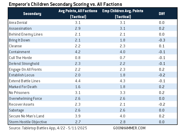 Looking at scoring data in TTBA, it looks like Emperor's Children players tend to do reasonably well in primary scoring but struggle a bit when it comes to secondary objectives. In particular, Bring it Down and action secondaries like Establish Locus and Recover Assets tend to be lower-scoring for them - though not by a lot, admittedly. Their secondary scoring challenges likely stem from the challenge of being an elite army - something we've looked at previously in my