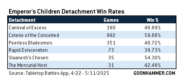 Over the last two weeks we've seen 1,832 games reported for the Emperor's Children, with a win rate just over 54%, putting them in the top third of factions over that period. Of these, just over half (992) were played with Coterie of the Conceited, which has become the army's go-to pick.