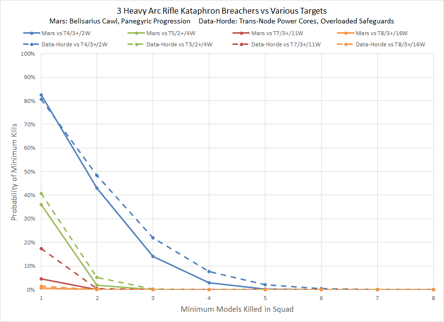 driving attribute but also bypass one of the gatekeepers. For a unit with a 4+ BS this effectively doubles the number of hits that land. To take a look at the effect let's compare the Mars and Data-Horde Forge options. We'll take a unit of 3 Kataphron Breachers firing Heavy Arc Rifles. For Mars we'll assume Belisarius Cawl is nearby for re-rolling hits and that