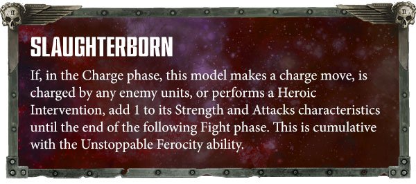 Abilities: Unstoppable Ferocity (+1S, +1A on charge), Deathbringer (unmodified hit roll of 6 is 2 hits), Slaughterborn (+1S, +1A)
