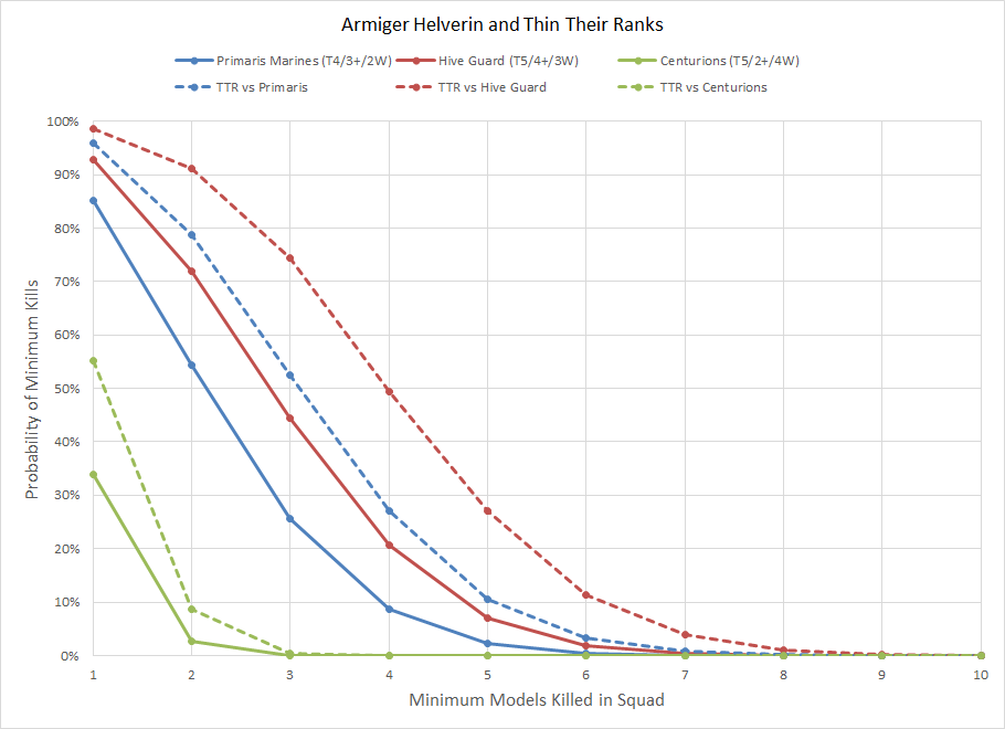 Primaris and Hive Guard definitely suffer a considerable amount, with the maximum shots translating to a roughly extra shot going through. Unsurprisingly the low AP of the armiger autocannons poses a challenge and nullifies the benefit significantly, particularly for 2+ models like Centurions. The lines will also apply for any other unit with a toughness between 4 and 6 with a 3+ or 4+ save. Against Deathwatch Fortis Kill Teams this is an