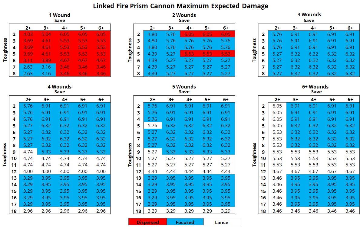 for the vast majority of scenarios for a Fire Prism utilizing, the focused profile is the superior choice. The exception being that the lance is better against most T9 to T12 targets, and against 6+ wound targets with a 2+ armour save.