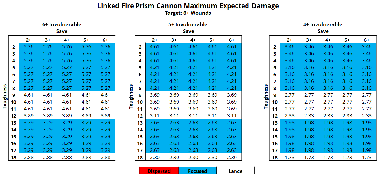 The high armour penetration value offered by these weapons even in dispersed fire mode means that in general the presence of an invulnerable save won't do much to alter our probabilities. The biggest difference is in the first column against targets with a 2+ save. Here the difference in penetration between the focused and lance profiles becomes irrelevant and the only thing that matters is the difference in shots, damage, and wound rolls.