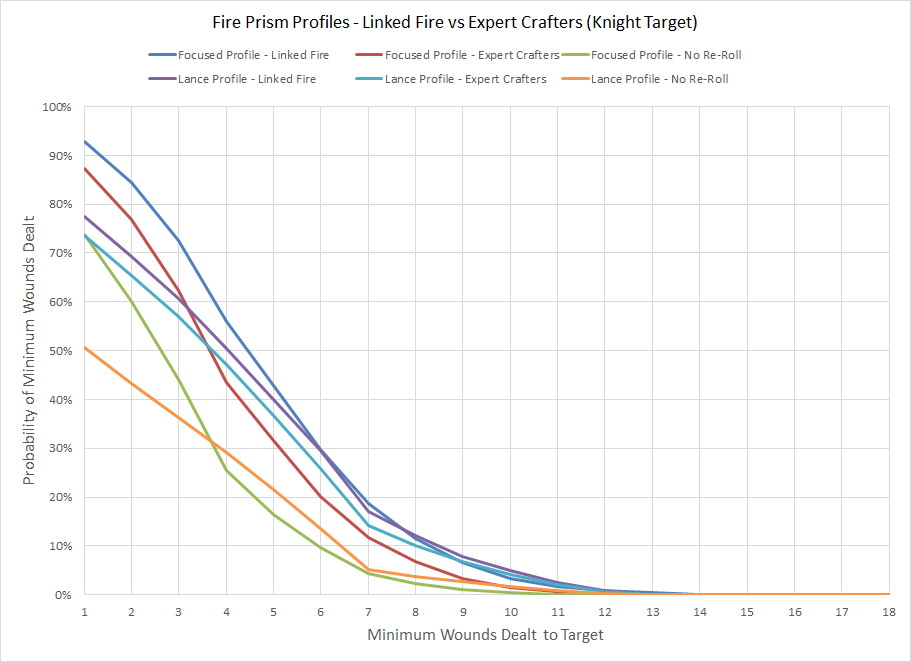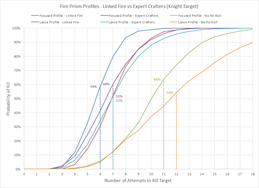 Expert Crafters trait which allows a model to re-roll one hit and one wound each time a unit shoots, fights, or fires Overwatch. The basic effect is identical to Linked Fire, but since it only works once per attack the efficacy is reduced as the number of shots increases. This makes it preferable for low quantity, high quality attacks such as the lance profile where the probability of both shots missing is only 11%. Since the number of scenarios for this application can easily become a mess let's take a more general approach and look at a specific situation; blasting a Knight into pieces.