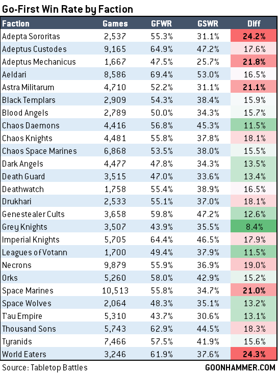 - Grey Knights have the smallest delta. Although they don't win a ton of their games, the Grey Knights have the easiest time of it going second compared to going first. Possibly because of how easily they can move around the table.