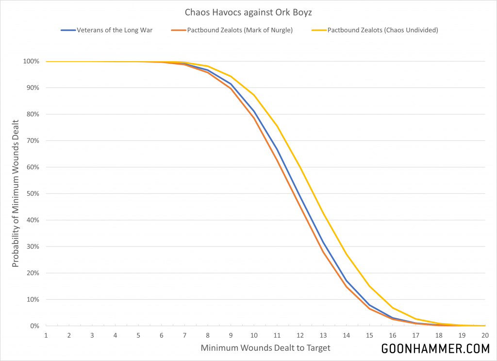 The overlap is pretty high, but the option to re-roll wounds and re-roll hits with Pactbound Zealots and MoCU is slightly stronger in this application. Two units would have a pretty good chance of taking out a fully loaded unit of Boyz... but you can only use the Profane Zeal Stratagem on one at a time. Without Zeal your expectation drops to something more like 8 wounds.