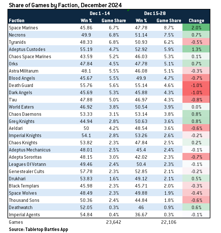 Generally speaking, while players played about 1200 fewer games in the past two weeks compared to the first two weeks of December, we saw very little change in actual faction play. The biggest observed changes had as much to do with the Dataslate as the Detachments. Specifically, Space Marines jumped from 6.7% to 8.7%, the largest single faction jump , while Dark Angels dropped by a full percentage point, likely the source of the loss. Custodes had the second biggest bump at +1.3 percentage points. No faction dropped by more than 1 point, with the two factions dropping 1 point being Dark Angels and Death Guard. Space Marines regained their status as the most-played faction from Necrons despite Necrons going up a 0.7 percentage points in game share, from 6.8% to 7.5% (the second most popular faction).